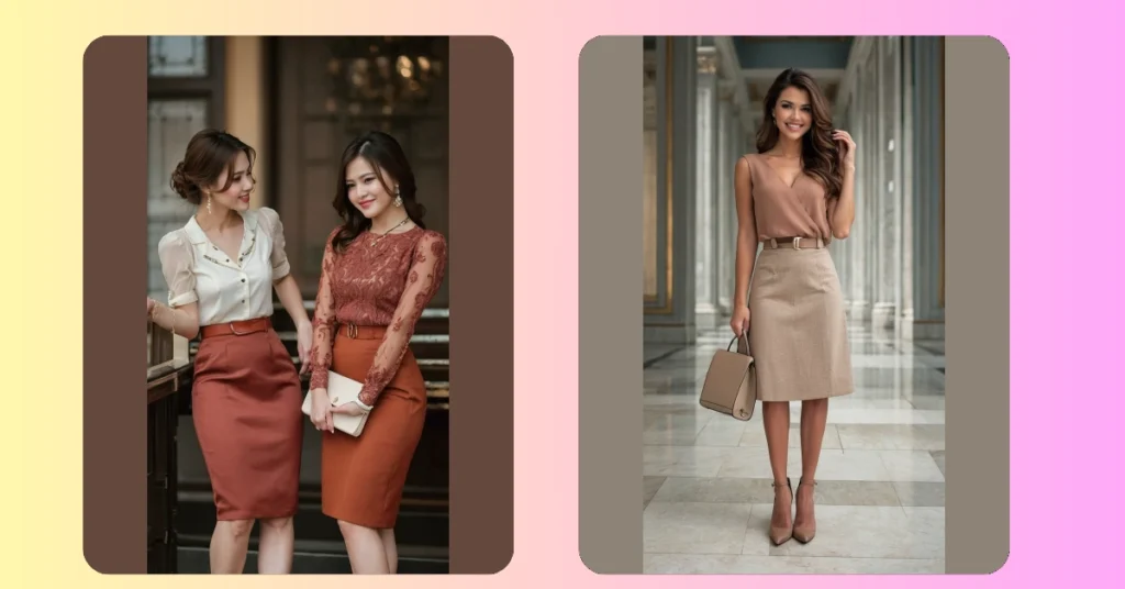 These two ladies are rocking their skirts and showing us that a little bit of style can go a long way. The girl on the left is looking super chic in her white shirt and orange skirt, while the girl on the right is giving off serious “boss lady” vibes with her lace top and matching skirt. They both look like they’re ready to take on the world, and their outfits are definitely helping them do it in style! It’s like they’re saying, “We may be wearing skirts, but we’re not messing around!”