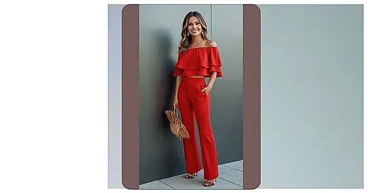 This lady is definitely ready to turn heads! Her red outfit is like a walking stop sign, but in the best way possible. From the off-the-shoulder top with its adorable ruffles to the perfectly tailored pants, this look is both stylish and confident. And let’s not forget the woven bag, adding a touch of summery fun to the whole vibe.
