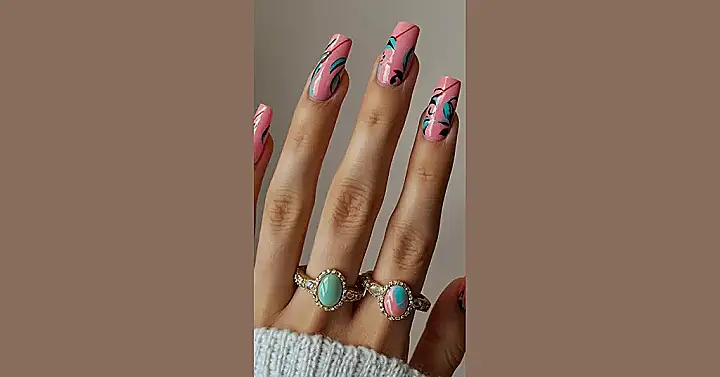 These nails are totally giving us “chill vibes meets holiday cheer.” The pretty pink base is like a cozy sweater on a snowy day, and those teal swirls? They’re like a sneaky peek at a festive winter wonderland hidden in the forest. It’s the perfect mix of simple and stylish – you can totally rock these to your grandma’s house for Christmas dinner, or even to a holiday party with your friends! Plus, they’re so easy to do, even if your nail skills are as clumsy as a reindeer trying to ice skate.
