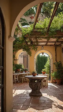 Stepping onto this Italian patio feels less like just going outside and more like you’ve stumbled into a secret level of super chill. Seriously, look at all those plants! They’re thriving, probably having tiny plant parties and gossiping about how much sun they got today. The stone floor is all warm and inviting, basically rolling out the red carpet for your feet, and the whole vibe just screams “put your phone away and relax.” It’s the ultimate escape hatch from homework and annoying chores, a green little slice of paradise designed purely for good moods.