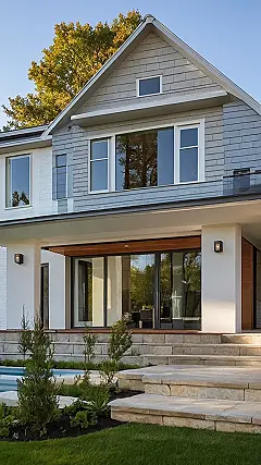 This renovated house is seriously stunning! Just look at that crisp, clean exterior – it’s like someone took a brand-new house and gave it a super stylish makeover. Imagine having those perfectly manicured lawns to kick a soccer ball around on, or just chilling on the porch swing after a long day at school. It’s the kind of place where you could totally picture yourself hosting the best sleepovers ever, with everyone gathered around giggling and telling stories.