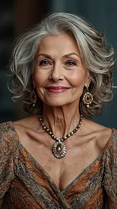 This woman is rocking her silver hair with a confidence that could make a teenager jealous! She’s got a style that says, “I’m over 50 and I’m not afraid to show it!” Her layered hair is like a waterfall of silver, framing her face and making her eyes sparkle. It’s like she’s saying, “I’ve seen a lot, and I’m still here, looking amazing.” She’s got a smile that could light up a room, and she’s totally owning her age, which is honestly pretty awesome.