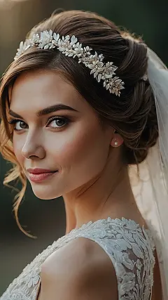 Forget the boring updo! This bride’s got a hairstyle that’s totally 2025-ready, and it’s giving us major “fairy princess meets modern chic” vibes. Check out that gorgeous flower crown—it’s like a delicate halo of sparkle and whimsy, perfectly complementing the sleek, elegant bun. It’s the kind of hair that would make even your grandma say, “Wow, that’s pretty!” Seriously, who needs a tiara when you’ve got this much dazzling detail?