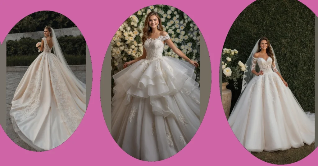 This dress in the picture is seriously like something out of a total fairytale! Look at all that flowy skirt and the pretty lace detail on the top – it basically screams “main character energy.” Wearing a dream wedding dress this epic probably makes you feel like you could float down the aisle, or at least requires three people just to help you navigate stairs without becoming best friends with the floor. It’s definitely the kind of dress you daydream about while doodling in class.