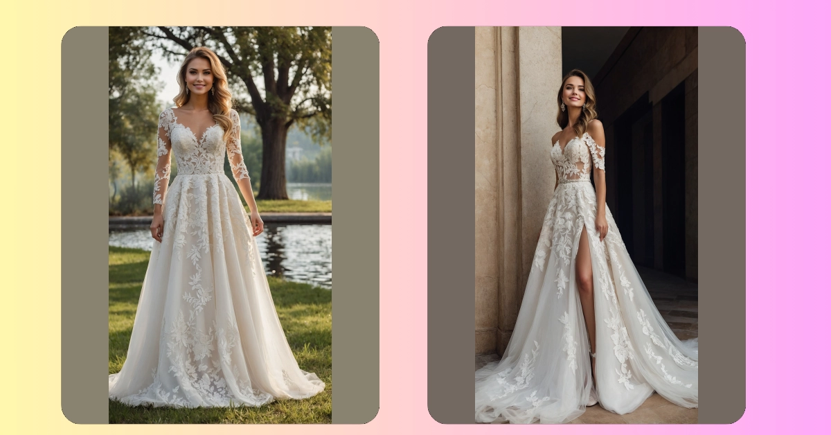 This dress looks like it was definitely plucked straight out of a fashion fairytale! It’s got all the fancy lace, the off-the-shoulder vibe, and a train so long it might need its own zip code. Wearing something this beautiful would probably make you feel like a total movie star, just hopefully without the part where you trip dramatically on the stairs. It’s the kind of dress that makes you instantly feel like the main character, ready for your epic slow-motion entrance.