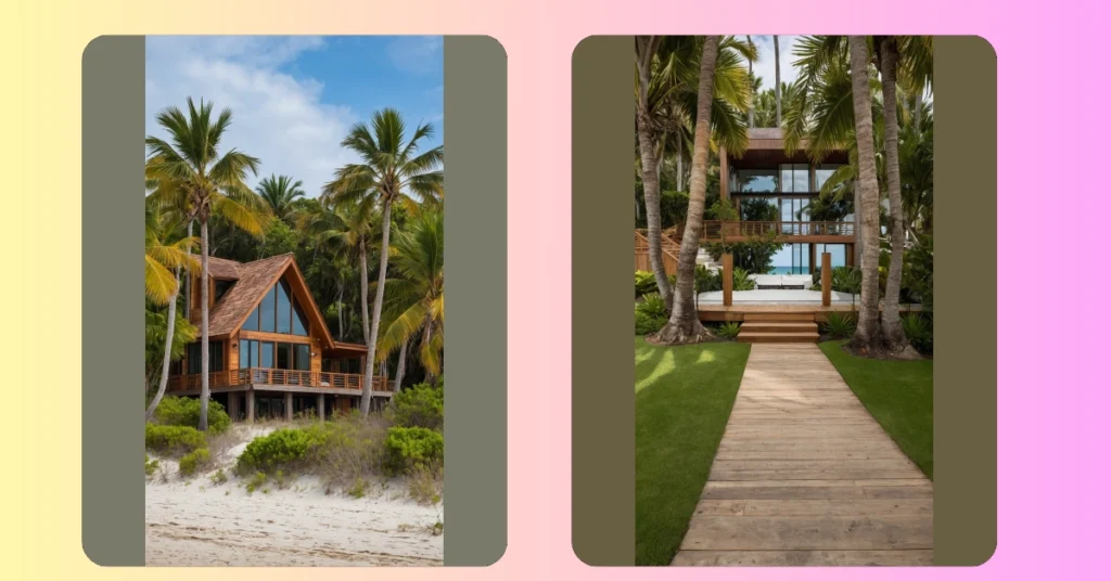Walking up that cool wooden path feels like the entrance to a secret tropical level in a video game, only way better because there are actual giant palm trees and zero scary bosses (hopefully). This isn’t just some random building; it’s a whole vacation mood wrapped up in a beach house design. Surrounded by all that lush green, you half expect a friendly parrot to squawk directions to the nearest hammock. It’s the kind of place that screams “forget your worries” the moment you arrive.