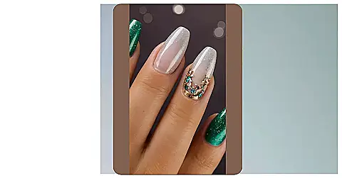 The emerald green nails add a pop of color that’s perfect for the season. Imagine showing off these beauties while sipping hot cocoa by the fireplace – you’d be the most stylish elf around! This manicure is like wearing a tiny Christmas tree and a cute reindeer on your hands, all at once. It’s definitely nail-spiration for the holidays!