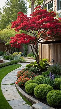 Check out this garden! It’s got that fancy vibe, like somewhere you’d expect someone important to be strolling around looking thoughtful. That fiery red tree is basically the main character, stealing the spotlight from all the perfectly puffed-up green bushes lined up like they’re ready for inspection. The winding stone path looks super inviting, making you want to follow it to see if there’s a hidden treasure chest or maybe just a really comfy bench waiting for you. It feels like a little slice of calm and beauty tucked away, kind of like the awesome secret hideout you always wished you had.
