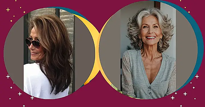 The picture shows a woman who’s rocking a hairstyle that’s totally on trend. It’s called “layered hair” because it has different lengths of hair, making it look super cool and stylish. And guess what? It works perfectly for anyone over 50!