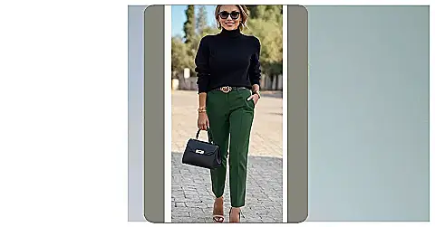 Looking ready to absolutely crush your day is a vibe, and this outfit totally nails it! Forget searching for ancient history textbooks, these green pants and sleek black top are basically saying, “Yep, I’m here to adult, and I look good doing it.” It’s the perfect blend of professional and cool, like you’re serious about getting stuff done but also secretly thinking about what snacks are in your bag. That stylish belt and the structured bag just add that extra touch of “I’ve got this,” making you feel powerful enough to take on anything – even that really tough math problem.