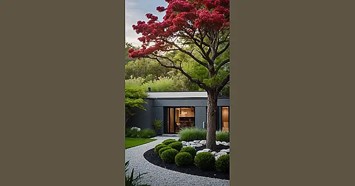 The tree, with its beautiful, almost glowing red leaves, is like the star of the show. The rest of the yard is like a supportive cast, making sure everything looks sharp and put together. It’s a reminder that modern landscaping can be simple, stylish, and totally awesome – just like you!