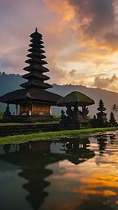 This picture shows a temple in Bali, which is a super popular place for tourists to visit. The temple is really cool, with its layered roof and carvings. The best part is that it’s sitting right on the edge of a lake, and the whole thing is reflected in the water like a mirror. It’s like the temple has a twin, but the twin is upside down!
