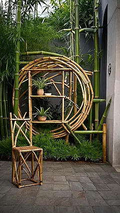 Check out this awesome bamboo setup! It looks like someone went totally bamboo-zled, in the best way possible. There’s a chair that’s literally made of bamboo, and this crazy cool circular shelf thingy that’s also bamboo. It’s like a zen garden, but with extra steps and a super commitment to one material.