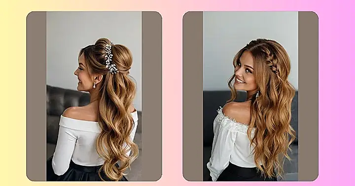 This hairstyle is like a fairytale come true! Half up, half down, it’s the perfect blend of elegant and playful. That sparkly hairpiece? It’s like a tiny constellation landed on her head, ready to guide her to happily ever after. Imagine all the compliments she’ll get— it’s practically begging for a slow-motion twirl! Seriously, this is major prom-worthy or even wedding-worthy hair, and it’s totally achievable.