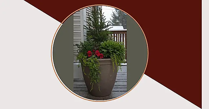 This planter is like a little winter wonderland on your front porch! It’s got all the cozy vibes of a snowy day, even if it’s just a tiny bit of snow falling from the sky. The big brown pot is like a warm fireplace, and the green plants are like the snow-covered trees outside. The red flowers are like a fire crackling away inside, adding a pop of color and making everything feel nice and cheery.