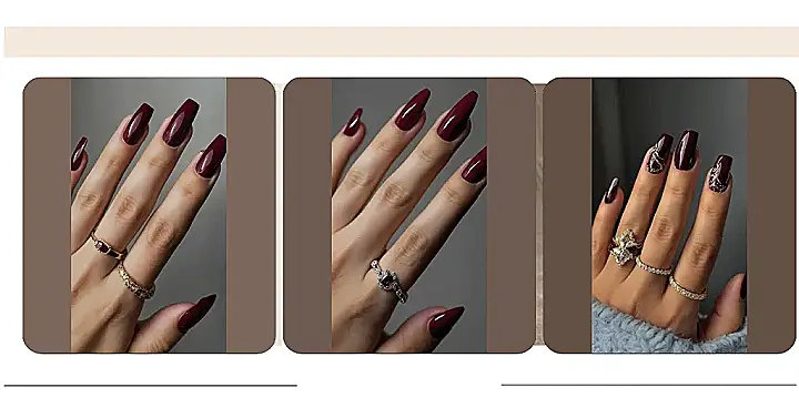 Wow, check out those nails! That deep burgundy color is totally sophisticated, like something a super-stylish spy would wear. And all those sparkly rings? It’s like the hand is having a jewelry party, and the burgundy nails are the awesome VIP guests. This is the perfect look for when you want to feel fancy and ready to take on the world, or maybe just ace that big math test.