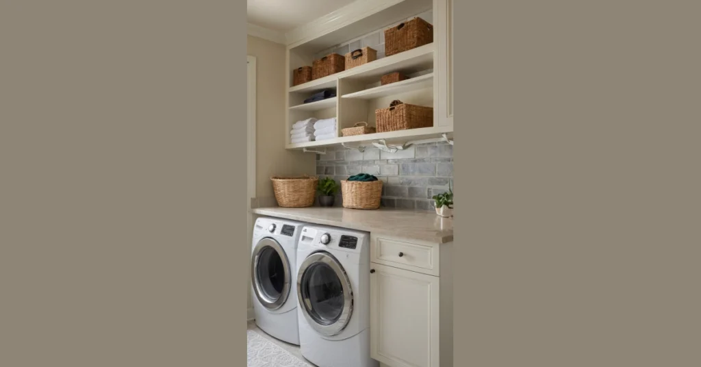 This laundry room isn’t just a place to toss your dirty socks; it’s a stylish haven of organized cleanliness! Check out those baskets – they’re like tiny, woven treasure chests waiting to be filled with freshly laundered clothes. It’s almost too pretty to actually do laundry in, which means you might be tempted to just admire it all day. That’s okay too; taking a moment to appreciate a well-organized space is always a good thing!