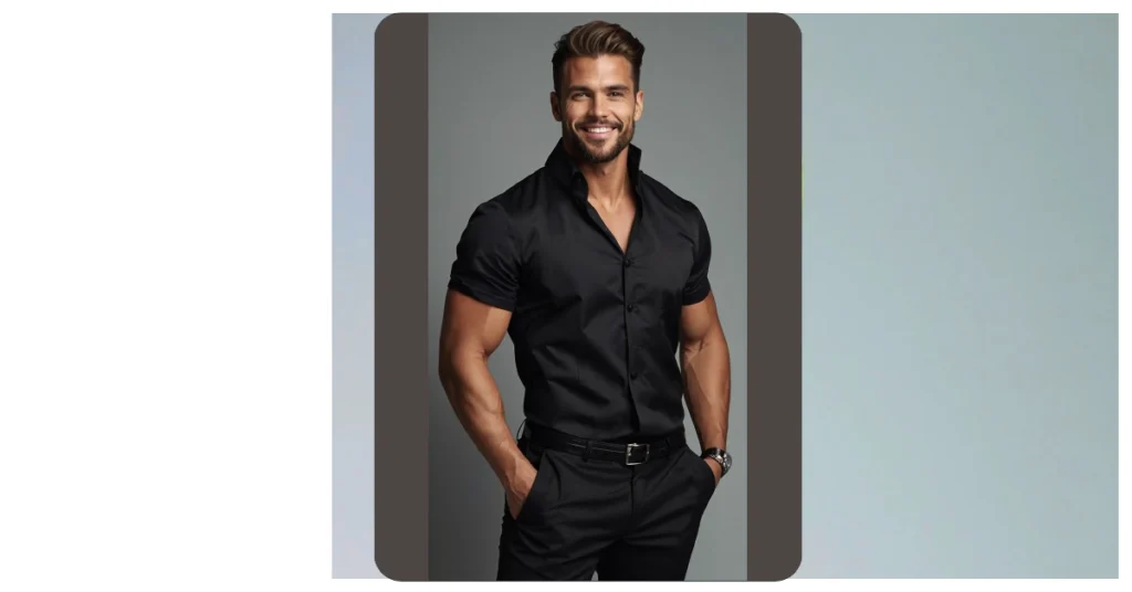 This Valentine’s Day, ditch the cheesy Cupid costume! This guy’s got the ultimate “men’s Valentine’s Day outfit” figured out. He’s rocking a sleek black shirt and pants – super stylish and effortlessly cool. No need for a bow tie or anything too fussy; simple, sharp, and ready to impress that special someone. You’ll be looking dapper enough to sweep them off their feet without looking like you tried too hard (which is way more impressive).