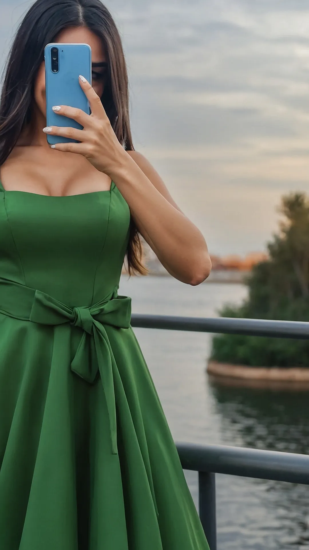 This girl is definitely rocking that vibrant green dress! It’s like a pop of color against the beautiful blue sky and water. She’s got the perfect pose for a selfie, and you can almost hear the “click” of the camera. It’s a classic look that’s totally timeless, and it’s no wonder she’s feeling confident in that dress.