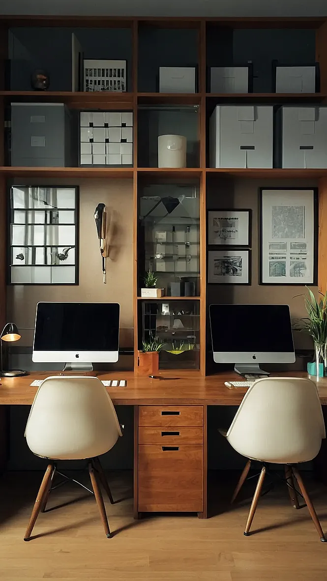 The image shows a beautiful, modern office space, designed for both productivity and comfort. It’s like the grown-up version of your dream room – spacious, light, and organized. The big, sleek computers invite you to get work done, while the comfy chairs look like they’re whispering, “Take a break, you deserve it!” And look at those shelves – they’re crammed with books, pictures, and fun knick-knacks. It’s like this office is saying, “Let’s get down to business, but don’t forget to have some fun along the way.”