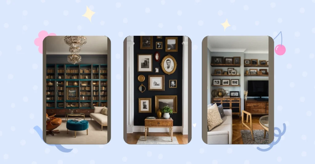 This room is like a time machine! Look at all those vintage frames on the gallery wall – it’s like a family photo album exploded onto some seriously cool shelves. I bet those old pictures tell amazing stories about great-grandparents, crazy vacations, and maybe even a pet hamster who wore tiny hats. It’s way cooler than just having your photos on your phone, right?