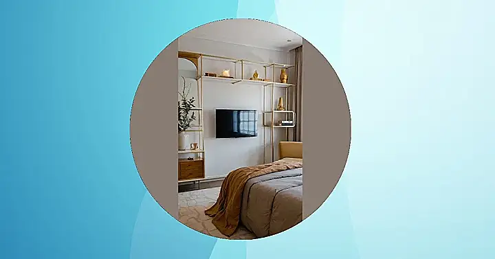 This bedroom is seriously chic! Forget boring, this space proves that simple room decor can be totally glam. That gorgeous gold shelving unit is like a grown-up version of a toy shelf – perfect for displaying your favorite books, candles, and maybe even a tiny golden statue of your pet hamster (don’t judge!). The neutral colors are super calming, but that mustard-colored throw adds a pop of fun that screams “cozy movie night!” It’s the perfect blend of sophisticated and comfy, proving that simple doesn’t have to mean dull.
