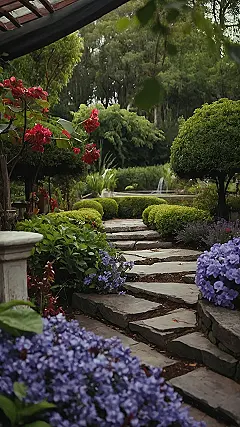 This garden is like something out of a fairytale! It’s got everything a classy garden needs: a beautiful stone path that winds through the lush greenery, bright flowers adding pops of color, and a peaceful little fountain that adds the perfect touch of serenity. It’s the kind of place you’d imagine royalty taking a stroll through, all fancy and stuff.