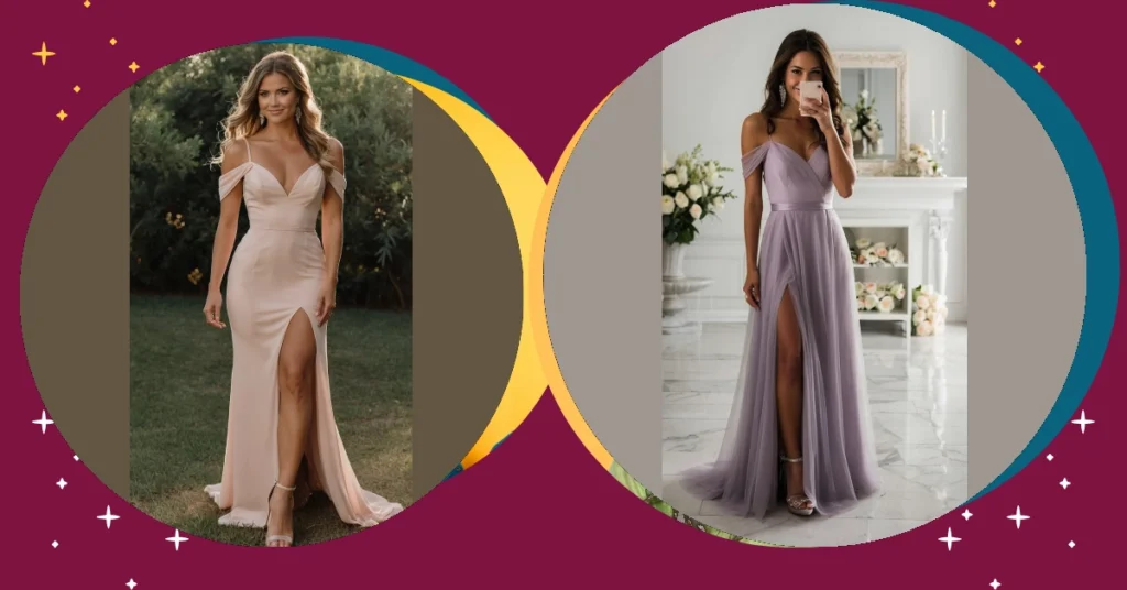 This dress is seriously stunning! Imagine rocking this gorgeous, blush-pink bridesmaid dress at your best friend’s wedding. It’s got that perfect mix of elegant and sassy, with the off-the-shoulder style and a leg-baring slit. You’ll feel like a total princess, but ready to hit the dance floor and show off your moves all night long. Forget frumpy bridesmaid dresses – this one’s a showstopper!