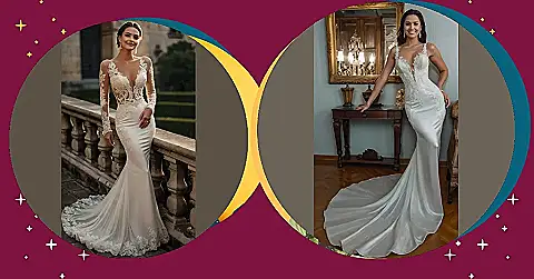 This bridal dress is giving us major “royal wedding” vibes, but without all the stuffy formality. Imagine yourself gliding down the aisle in this gorgeous gown – the long sleeves and intricate lace top are totally elegant, but that flowing train? It’s like a sparkly, silky river of awesome! You’d basically be a walking, breathing bridal dress aesthetic masterpiece, ready to conquer the world (or at least the dance floor).