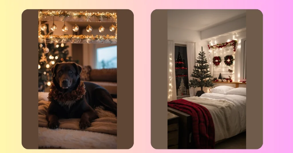 This adorable pup is all decked out for the holidays! They’re wearing a festive wreath around their neck, like a tiny, furry Santa Claus. It looks like they’ve found the perfect spot to relax and enjoy the cozy Christmas atmosphere. With all those twinkling lights and the comfy blanket, this doggo is ready for some serious holiday chill time.