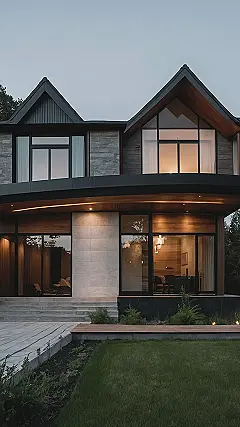 This house is like a super cool, modern art museum! It’s super sleek and stylish, with clean lines and simple shapes. No crazy patterns or colors here, just a calm and peaceful vibe. You could easily get lost in the huge windows, staring out at the beautiful green lawn. It’s like stepping into a picture!