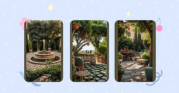 And if you’re chilling here, you might even find a sneaky snack growing on a tree nearby, like those little orange things! This patio isn’t just a pretty picture; it’s basically inviting you to relax, forget about homework, and maybe perfect your dramatic hand gestures like you’re actually in Italy, all while soaking up some seriously good vibes.
