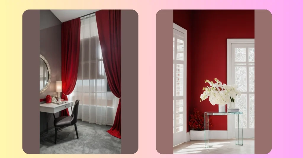 This picture shows a gorgeous red room, so red it’s almost shouting! But those stunning white orchids on the glass table are a perfect, cool contrast. It’s like a fiery volcano suddenly decided to chill out with a bouquet of elegant, icy flowers. They totally steal the show, making the whole room pop, even more so than the bold, red walls. Imagine having this amazing centerpiece in your own red room decor!