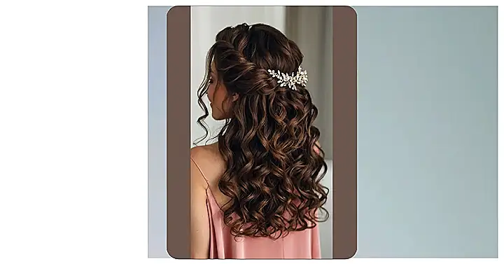 This picture shows a gorgeous bridal hairstyle perfect for anyone with naturally curly hair! Forget about fighting your curls – embrace them! This look keeps things loose and romantic, letting those beautiful waves do their thing. Plus, that sparkly hairpiece? It’s like a crown for your awesome curls, making you feel like a total princess on your big day. It’s the perfect blend of effortless elegance and sparkly magic. Who needs a tiara when you have this?