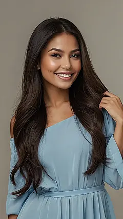 The image shows a girl with hair so straight, it’s almost like she’s got a ruler in her hair! She’s smiling and looking super happy with her sleek, straight locks. It’s like she’s saying, “Look at my hair, it’s straight as an arrow! No frizz, no flyaways, just pure perfection!” You can’t help but smile back at her, knowing she’s rocking that straight hair like a pro.
