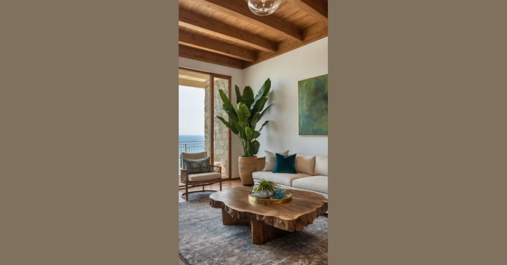 And seriously, how cool is that coffee table? It looks like it was carved from a giant piece of beach treasure, perfect for balancing your snacks or maybe even pretending it’s a tiny island. Then you look up at the ceiling with those wooden beams, which makes the room feel super cozy but also breezy and open, like you’re in the best treehouse ever, but with way better furniture. All these natural bits come together to make this place scream ‘coastal chic’ in the most chill way possible.