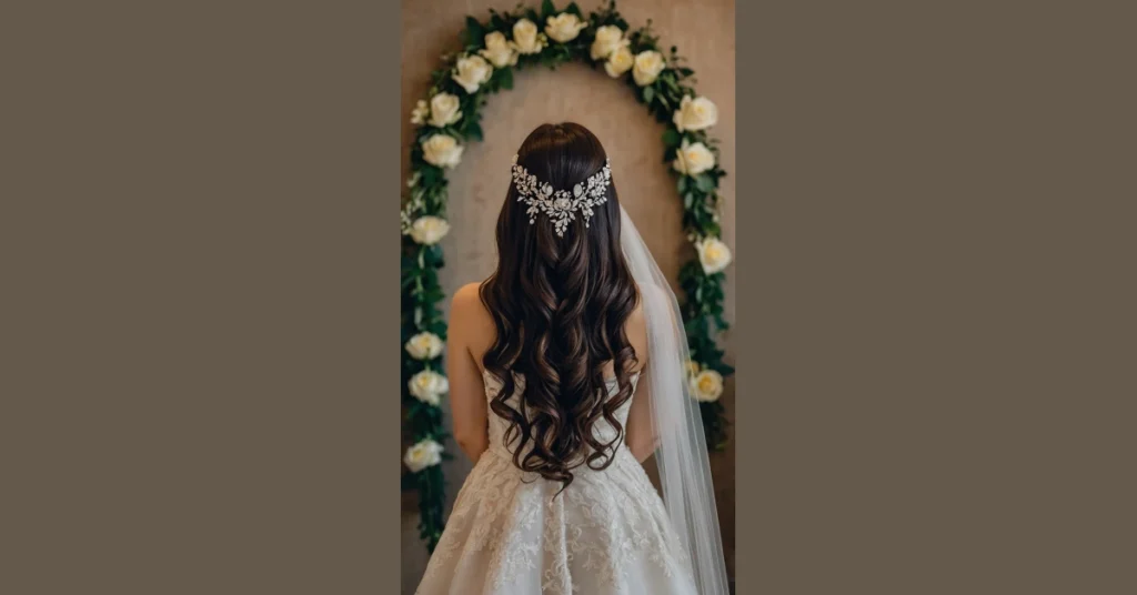 Planning a wedding and stressing about your hair? Don’t sweat it! This hairstyle is like the ultimate cheat code. You get those gorgeous, flowing waves that look super romantic, and then BAM! That sparkly accessory is the mic drop. It’s like saying, “Yeah, I woke up like this…but also, I have a professional hairstylist.”
