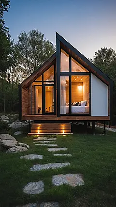 Peeking through those huge windows, you see right into the trees and sky, like being inside a giant, comfy nature box. Forget boring walls; this micro house feels like living *in* the landscape, especially with that cool path leading up. When the lights are on inside at night, it looks like a warm, glowing jewel box sitting in the grass – perfect for chilling out and watching the stars (or maybe just scrolling on your phone in a really cool setting).