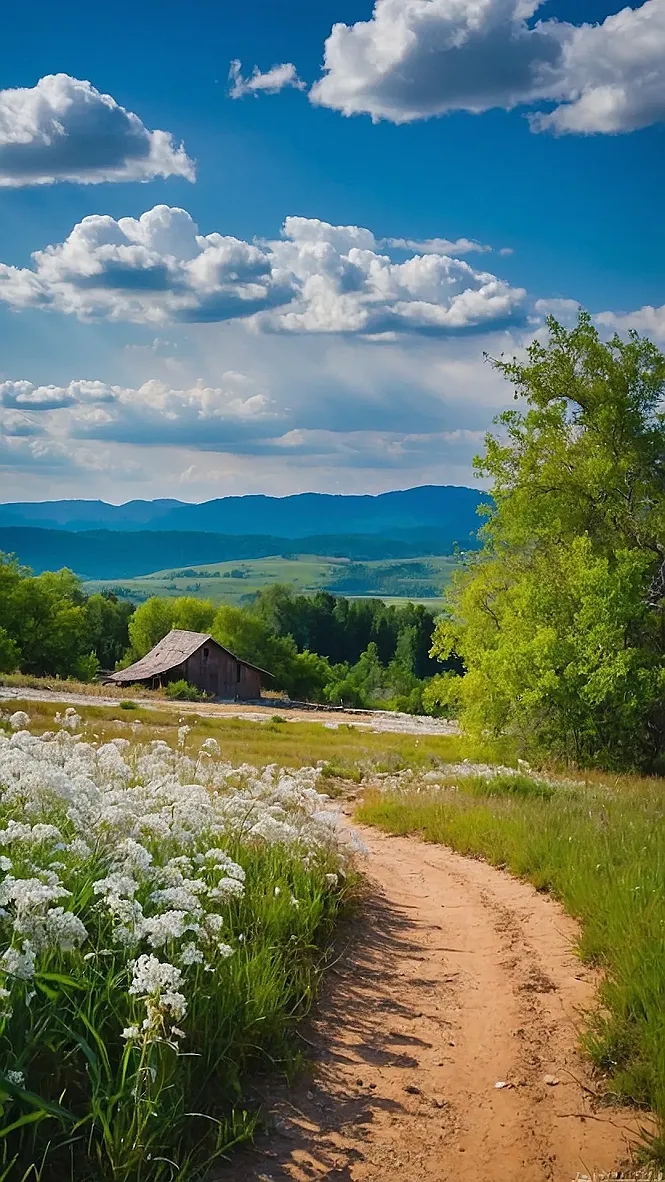 This picture is like a scene out of a storybook! Imagine walking down that dusty path. You’re surrounded by beautiful wildflowers, and the air is fresh and clean. The old barn in the distance looks like it’s been there for a hundred years, and the mountains in the background seem to go on forever. This picture makes you feel like anything is possible, and that life is full of adventure.
