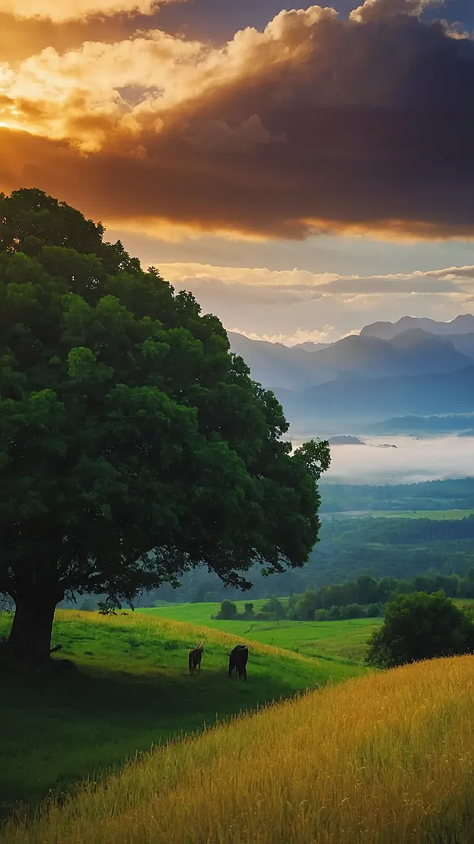 This picture is like a postcard from a super chill vacation! There’s this massive tree, like it’s the king of the hill, watching over the whole scene. The sun is setting, making the sky all orange and pink, and it looks like there’s even a little bit of fog down in the valley. Those two cows hanging out in the field are probably thinking, “Hey, what a great view for a snack!”