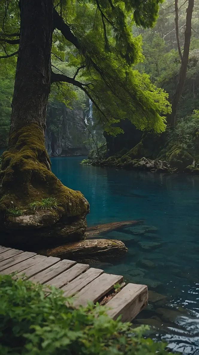 This picture looks like something out of a fairytale! Imagine a quiet, mossy forest with a little wooden bridge leading out over crystal-clear water. You can almost hear the soft sounds of the forest and the gentle trickle of a waterfall just out of sight. It’s so peaceful and serene you can’t help but want to take a deep breath and just soak it all in. It’s the kind of place where you can let your imagination run wild and dream up all sorts of adventures.
