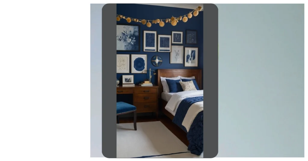 So, your dorm room is about to get a serious upgrade! This navy blue situation is like sinking into a cozy ocean, but without the sharks. The walls are giving off calming vibes, perfect for those late-night study sessions (or, let’s be honest, Netflix binges). Plus, all those framed pictures are like a built-in Instagram gallery, showcasing your awesome taste and memories for anyone who dares to enter your super-stylish sanctuary.