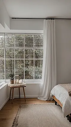 Check out this room! It’s got that giant window practically inviting the outside in, which is way cooler than looking at a blank wall (unless your wall has a secret candy dispenser, then maybe it’s a tie). With that little plant chilling on the side table next to some candles, it’s basically screaming “come here and relax already!” This kind of cozy bedroom decor makes you want to ditch your phone for like, five whole minutes and just soak it all in. Plus, it’s got major potential for dramatic staring out the window moments, rain or shine.