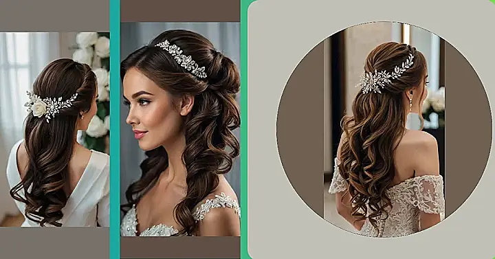 Wow, check out this hairstyle! It’s like a fairytale come to life. Those gorgeous, flowing curls are totally jaw-dropping, and that sparkly hairpiece? It’s like a tiny, glamorous firework show exploded right on her head! It’s the perfect blend of elegant and fun – imagine getting married with hair this amazing; you’d be turning heads all day long! You could practically hear a collective “ooh” and “aah” as she walks down the aisle!