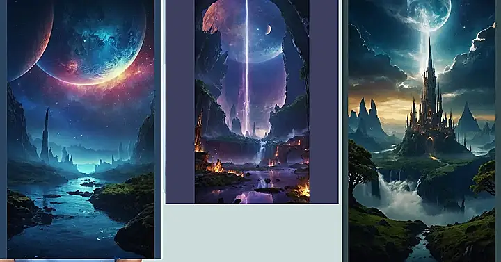 This picture is like someone took a fantasy world, threw in a giant space laser, and sprinkled it with extra sparkle! It’s got everything: waterfalls tumbling down glowing cliffs, mysterious ruins with little fires flickering, and a HUGE planet hanging in the sky with what looks like a giant purple lightning bolt shooting down to Earth. Imagine making this your wallpaper – you’d never get bored looking at all the cool details! It’s the perfect blend of fantasy and space, exactly what you’d expect from a ‘fantasy worlds wallpaper’!