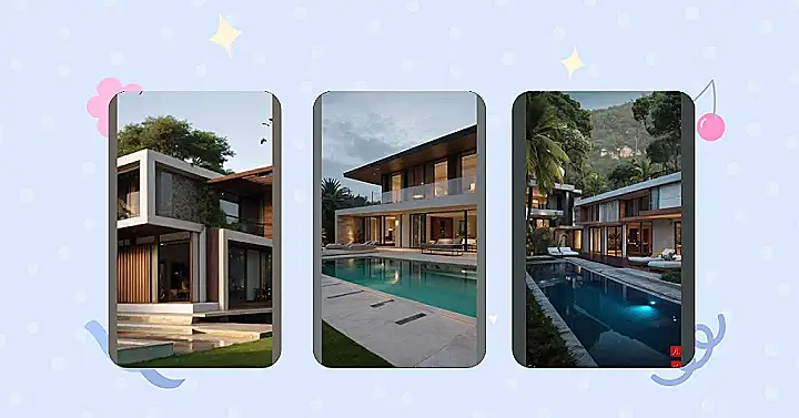 This villa is so fancy, it practically screams “I’m on vacation!” Just imagine yourself lounging by the pool, sipping on something refreshing, and soaking up the sun. The white walls and bright blue pool make the whole place feel fresh and breezy, like a tropical getaway. It’s the kind of place where you can forget about homework and just chill out – maybe even do a few cannonballs in the pool!