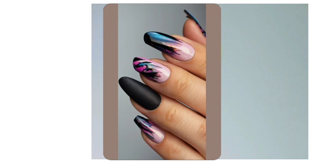 Check out these nails, they’re like a mini galaxy exploded onto someone’s fingertips! The black polish is totally giving off cool, mysterious vibes, especially with that one matte nail – it’s like the velvet rope of nail polish. And then BAM! The other nails have this awesome black, blue, and purple swirly design that’s giving major abstract art vibes. It’s like they’re ready to star in a music video.