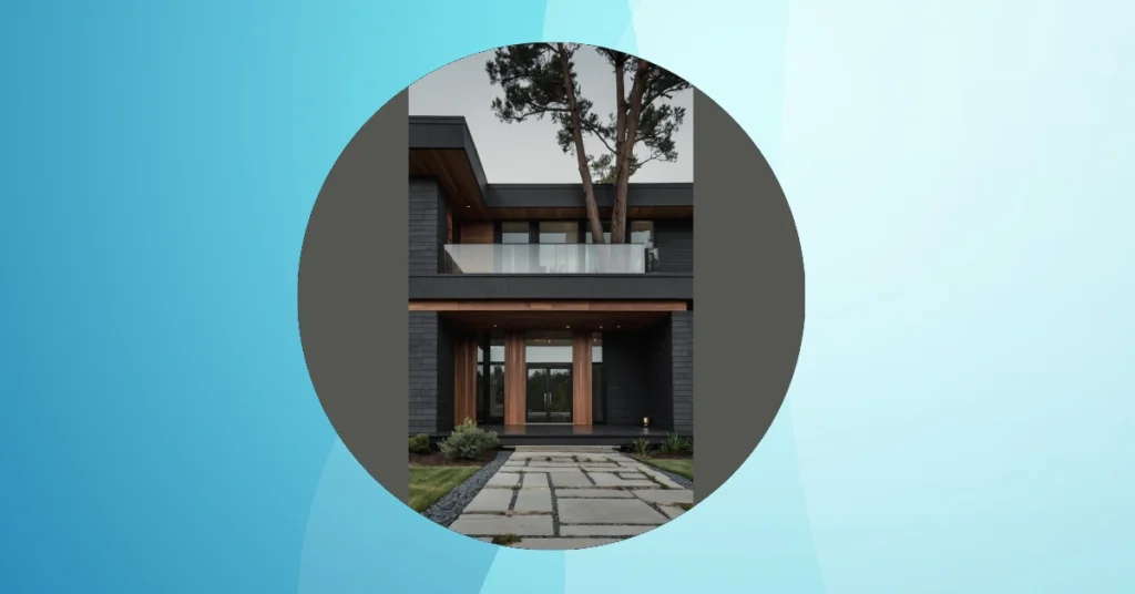 This house is like a super cool, modern spaceship that accidentally landed in the suburbs! It’s got all the sleek, dark colors and sharp angles you’d expect from a futuristic design, but then BAM! – it’s got a super comfy-looking front porch and a surprisingly normal-sized door. It’s like the architects were saying, “Hey, we can be modern AND practical, you know?” It’s the best of both worlds, kind of like getting pizza and ice cream for dinner.