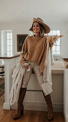 This outfit is giving major “I’m thankful for cozy sweaters and stylish pants” vibes. Imagine rocking this look at your family’s Thanksgiving dinner – you’d be the most fashionable turkey in the flock! That camel-colored sweater is so soft-looking, you’d probably want to wear it all day, and those striped pants are a perfect blend of comfy and chic. Add in a cute hat and some brown boots, and you’re ready to impress everyone, even your grandma!