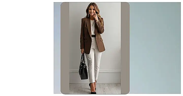 Forget frumpy office clothes! This combo proves that looking professional doesn’t mean sacrificing your personal style. The brown blazer adds a touch of sophistication, while the crisp white pants keep things fresh and modern. You can easily dress it up or down – maybe swap the heels for flats on a casual Friday, or add some fun jewelry to make it your own. Basically, this outfit is a blank canvas for you to express your awesome personality while still being completely ready for any office challenge.